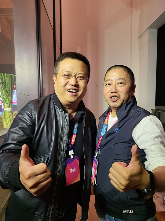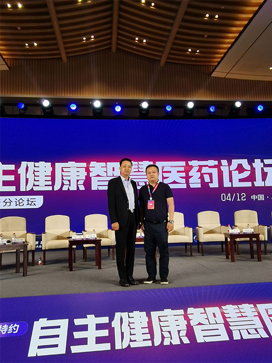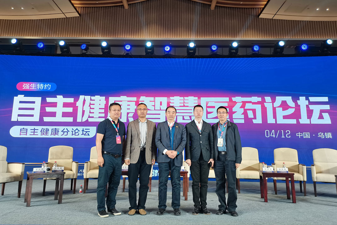圣大藥業(yè)公共關(guān)系總監(jiān)唐博勛(右一)與烏鎮(zhèn)健康大會(huì)主席、全國(guó)政協(xié)委員、中國(guó)非處方藥物協(xié)會(huì)輪值會(huì)長(zhǎng)、一心堂藥業(yè)集團(tuán)股份有限公司董事長(zhǎng)阮鴻獻(xiàn)(左一)合影